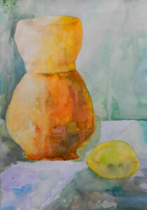 Абитуриенты выполняют этюд с натуры простейшего натюрморта из 2-х предметов на формате А3 акварельными красками. Экзаменуемый должен показать те же способности к восприятию формы простейшей натуры и передаче на бумаге её пространственного расположения и характерных признаков формы, но средствами живописи. Он должен поэтапно перейти от линейного рисунка натюрморта к его цветовой и тоновой моделировке (к работе в цвете акварелью):